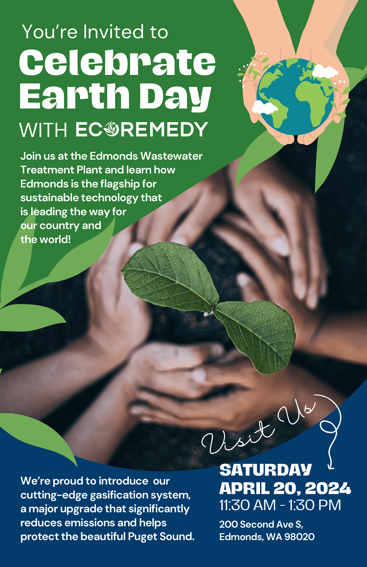 Ecoremedy celebrated Earth Day in Edmonds, Washington – site of the company’s newest project – by distributing growable planter kits to members of the community who visited the city’s wastewater treatment plant. The event served as a platform to showcase Ecoremedy’s innovative Fluid Lift Gasification™ process that greatly reduces emissions and contributes to a cleaner Puget Sound.
