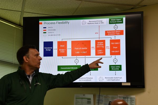 Ecoremedy President Dave Mooney walks participants through the various stages of the processAn additional plus: The new process is self-sustaining, meaning that it produces more energy than it uses, turning what was once a sewage sludge incineration plant into a city-owned renewable energy producer.