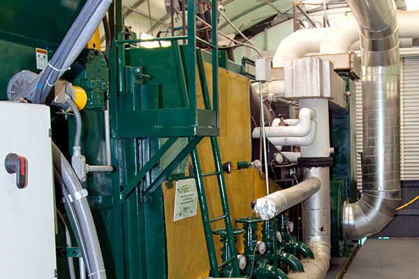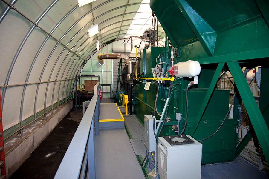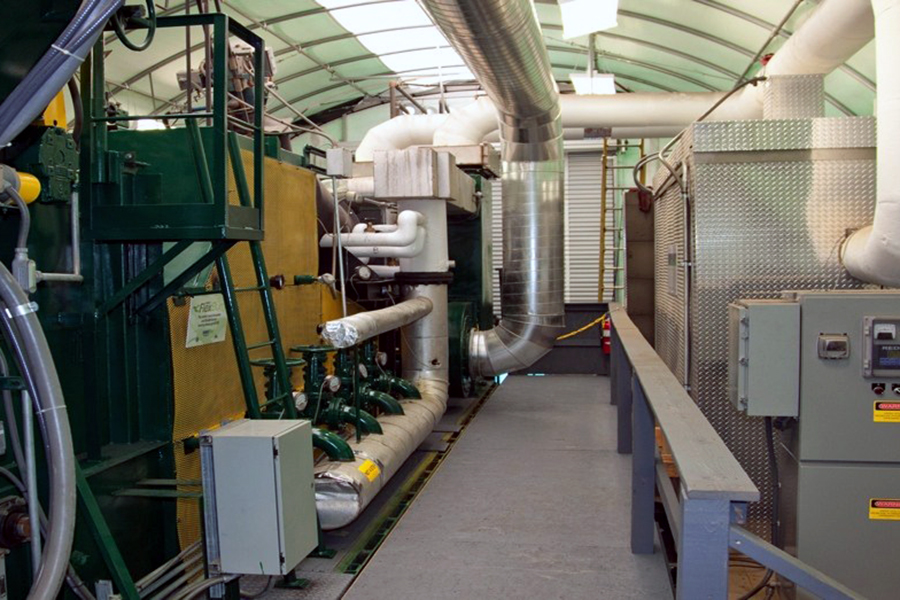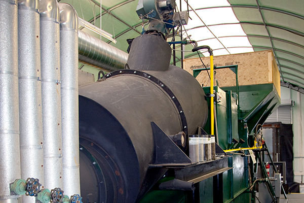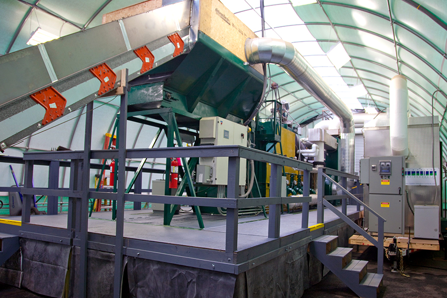 The mobile gasification equipment is mounted onto a 48-foot-long trailer and is housed inside a 38-foot-wide, 70-foot-long, and 19-foot-high green hoop structure. Syngas is produced during the patented gasification process, which powers a boiler to create steam. The steam can be used for thermal applications and/or to generate electricity to power a school, an industrial plant, a commercial complex, or the community. This facility served its purpose for the duration of the allowable permit, which expired in the summer of 2015.